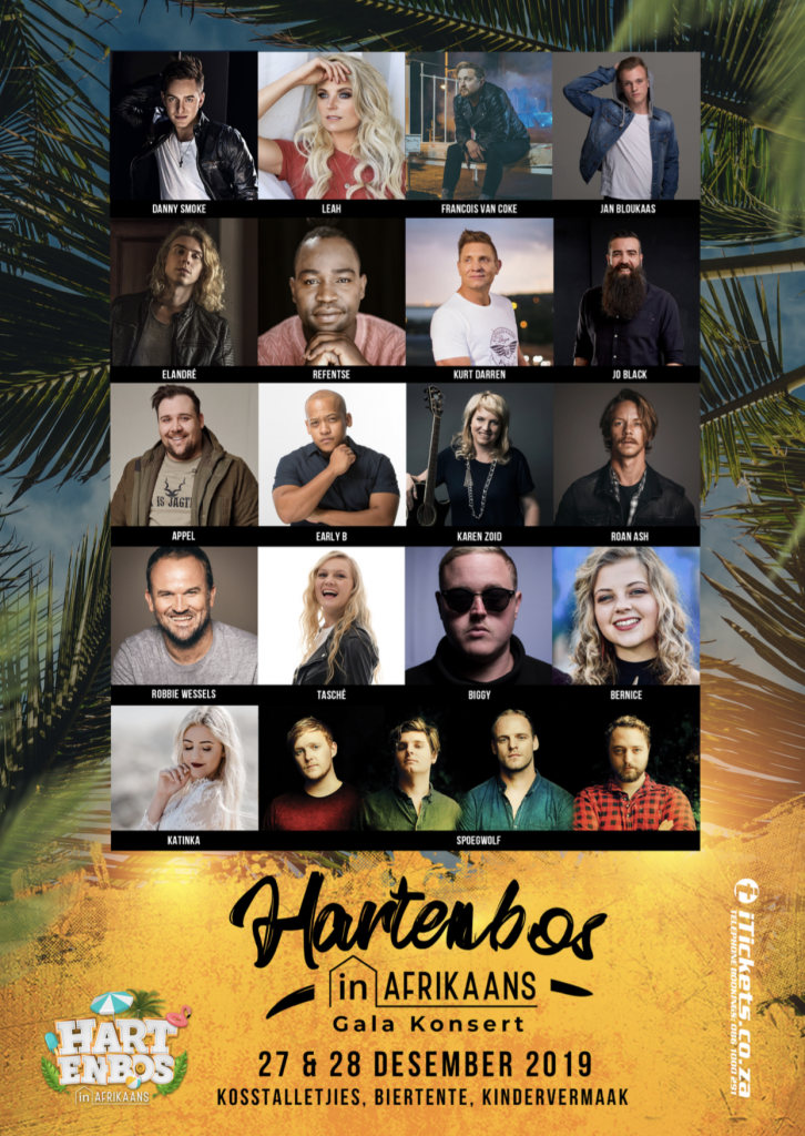 27 en 28 Desember om 19:30 – HARTENBOS IN AFRIKAANS-GALAKONSERTE met Danny Smoke, Leah, Francois van Coke, Spoegwolf, Elandré, Refentse, Kurt Darren, Appel, Early B, Karen Zoid, Bernice West, Jan Bloukaas, Jo Black, Roan Ash, Robbie Wessels, Tasché en Katinka. Kunstenaars sal deur van die land se beste musikante begelei word.