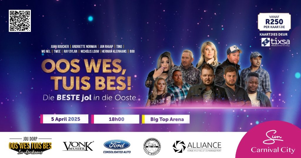 Oos Wes Tuis Bes is nie net ’n konsert nie – dis ’n viering van Afrikaanse musiek op sy beste. Hierdie eenmalige vertoning bied ‘n kans vir musiekliefhebbers om hul gunsteling kunstenaars op ’n ongelooflike verhoog te ervaar, in hul eie gemeenskap.Kaartjies is reeds beskikbaar op Tixsa se webwerf. Moet dit nie misloop nie – hierdie gaan die beste jol in die Ooste wees op 5 April 2025 by die Big Top Arena in Carnival City!