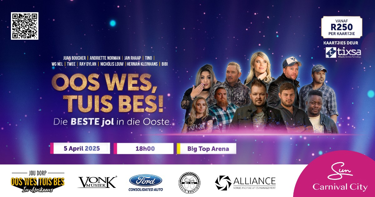 Die hart van Afrikaanse musiek klop op 5 April 2025 by die Big Top Arena in Carnival City wanneer van die land se grootste en mees geliefde kunstenaars byeenkom vir die eenmalige vertoning, Oos Wes Tuis Bes. Hierdie unieke musiekervaring bring topklas vermaak na die Oos-Rand en omliggende areas – ’n feesviering van ons taal, kultuur en musiek.
